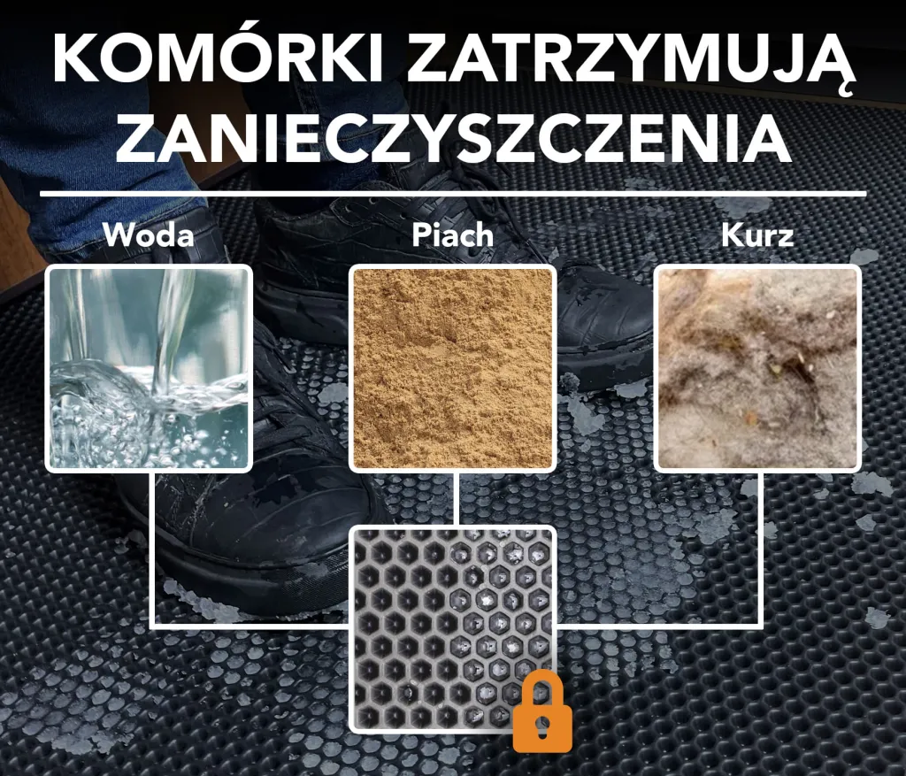Dørmåtten EVA Home er et nyt skridt i retning af at holde orden i hjemmet. Anvendelsen af et nyt teknologisk materiale øger komforten og garanterer modstandsdygtighed mod slid, samtidig med at det æstetiske udseende bevares. Takket være den cellulære struktur fanger EVA Home-måtter alle former for snavs mellem cellerne - dette betyder, at gulvet er beskyttet mod alt, hvad vi bringer ind fra gaden - vand, støv, sand, is, sne og mudder.