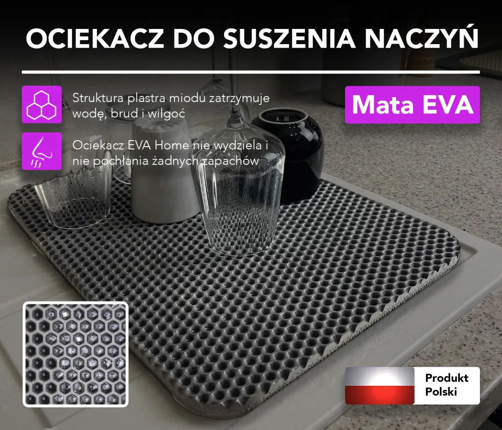EVA Home drypbakke er et nyt skridt i retning af at holde orden i hjemmet. Anvendelsen af et nyt teknologisk materiale øger komforten og garanterer modstandsdygtighed mod slid, samtidig med at det æstetiske udseende bevares. Honningkagestrukturen fastholder vand, rester af rengøringsmidler og fugt inde i cellerne. Tørring og rengøring er meget enkelt - du skal blot slå på den to gange nedenfra for at fjerne overskydende vand i cellerne. Den optager heller ikke meget plads.